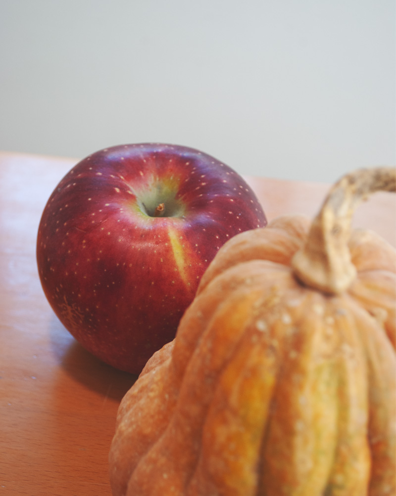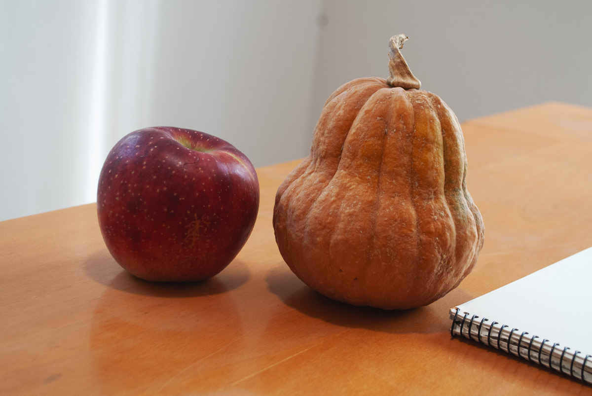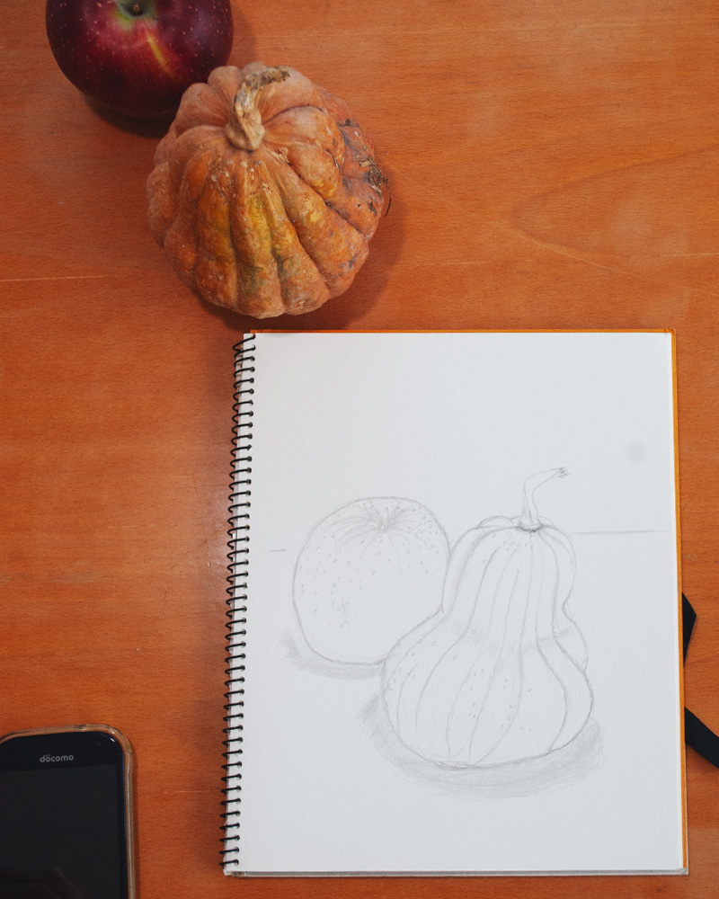 畑で採れた「鹿ケ谷かぼちゃ」と「りんご」を描き始めました。