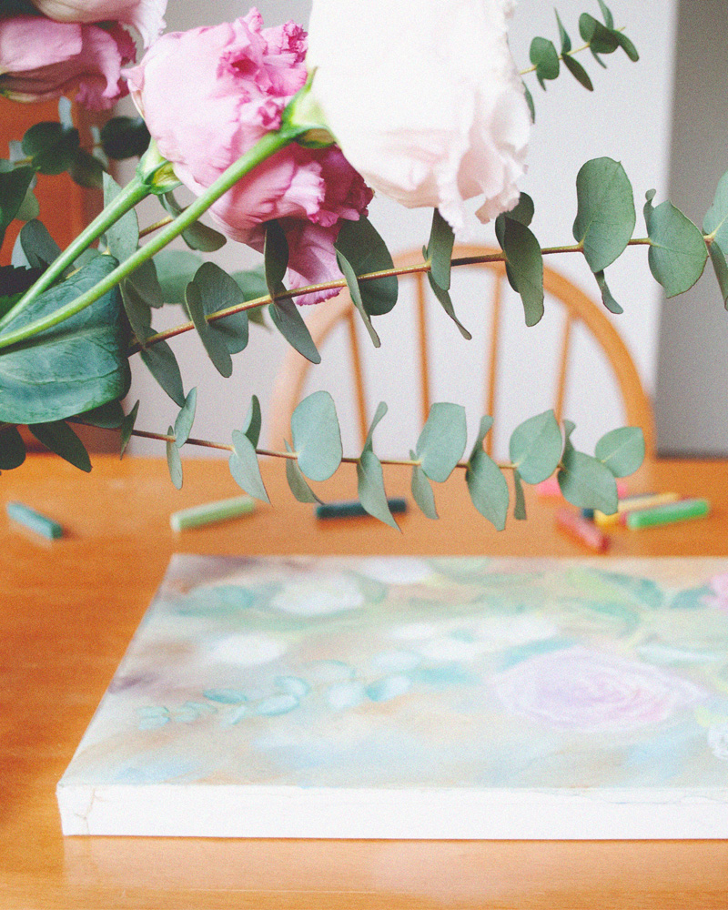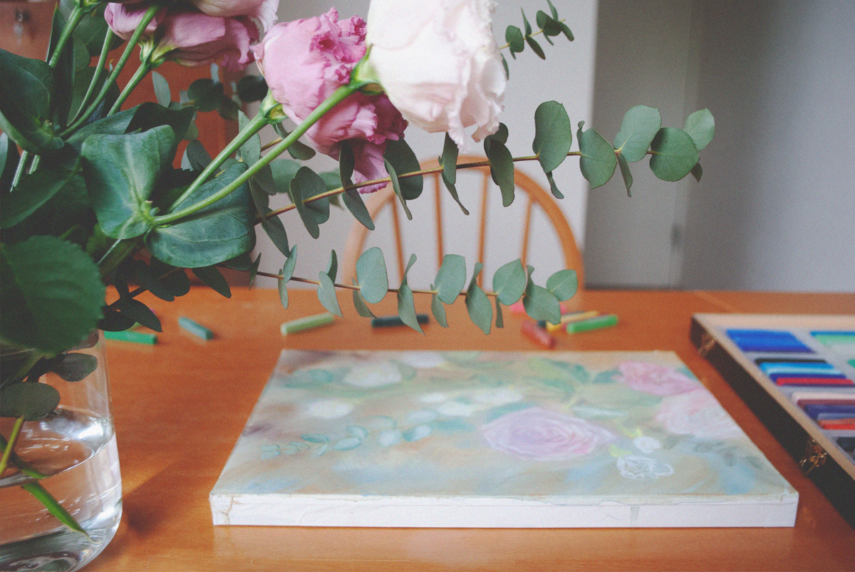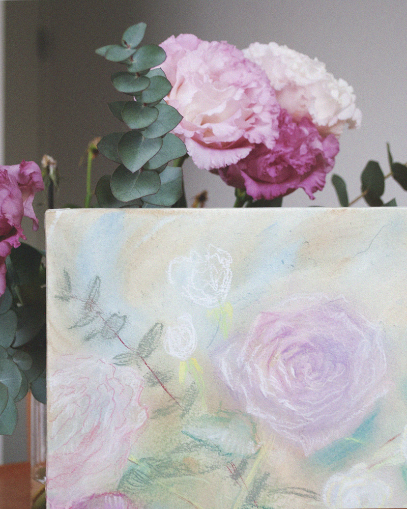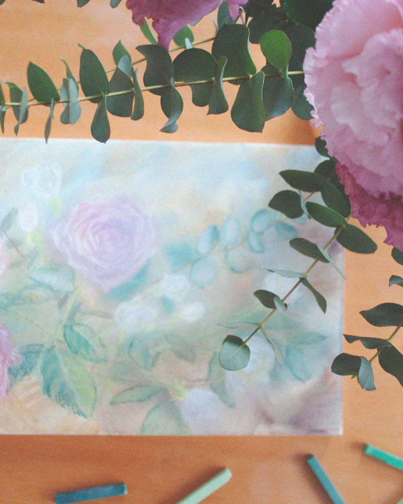 生徒さまからいただいた薔薇をパステルで描いてみました。パステル画は背景に色がある紙の上にのせていくと楽しい表現ができるといわれています。