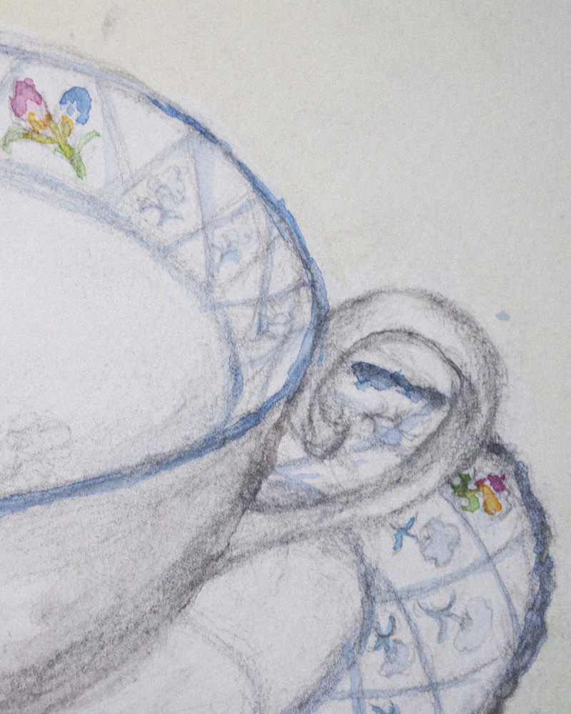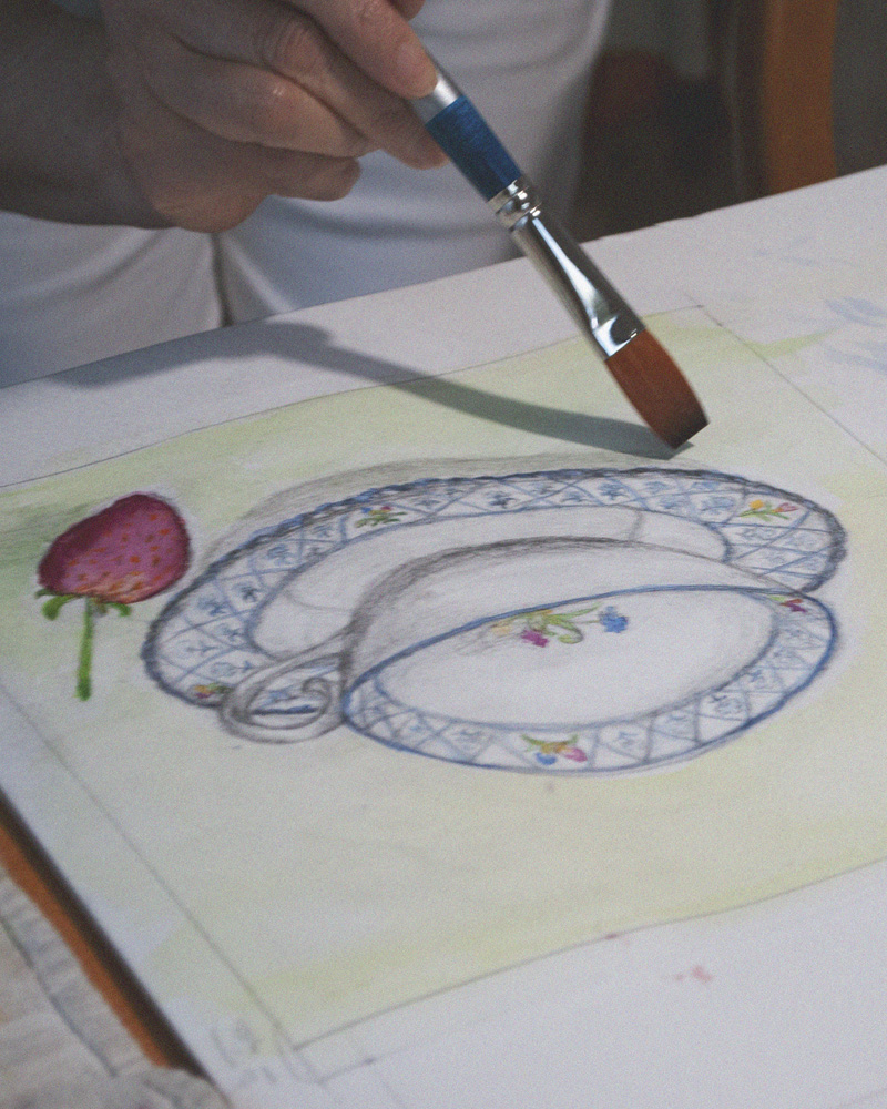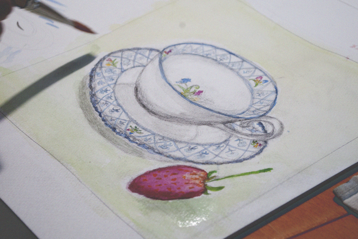 ティーカップと苺を描いていただきました。カップのちいさな柄の表現がかわいらしく、楽しそうです。苺はデッサンや着彩の基本を掴むのに画題としてもよく使われます。