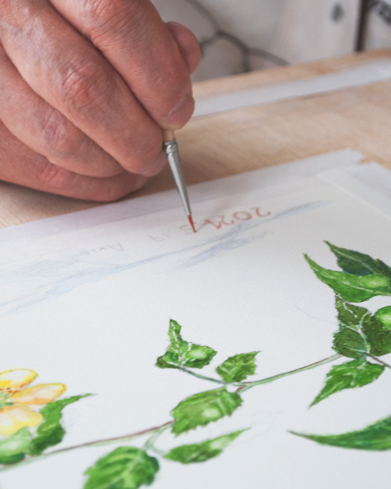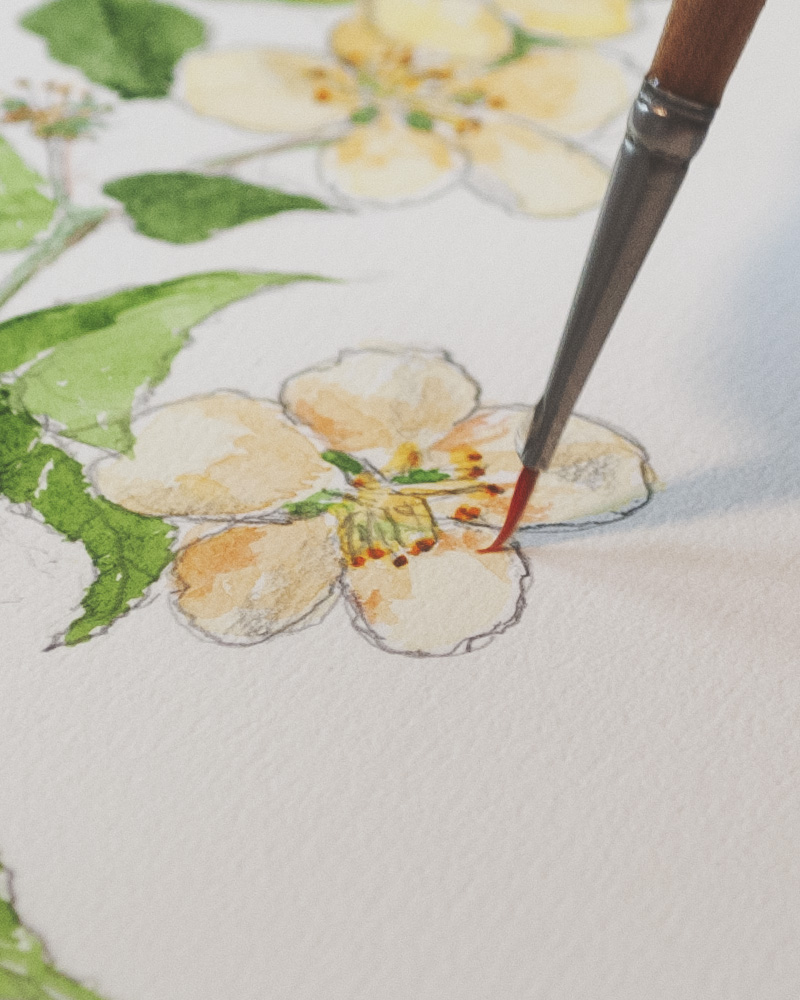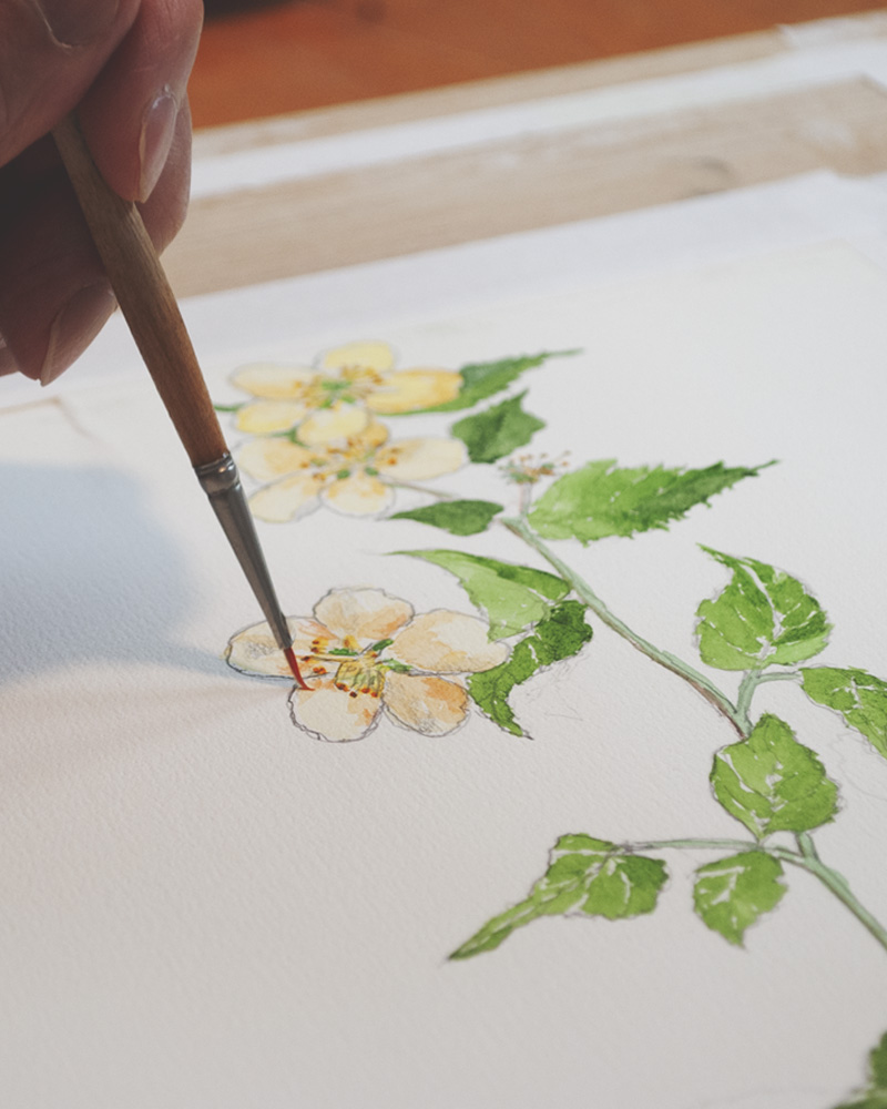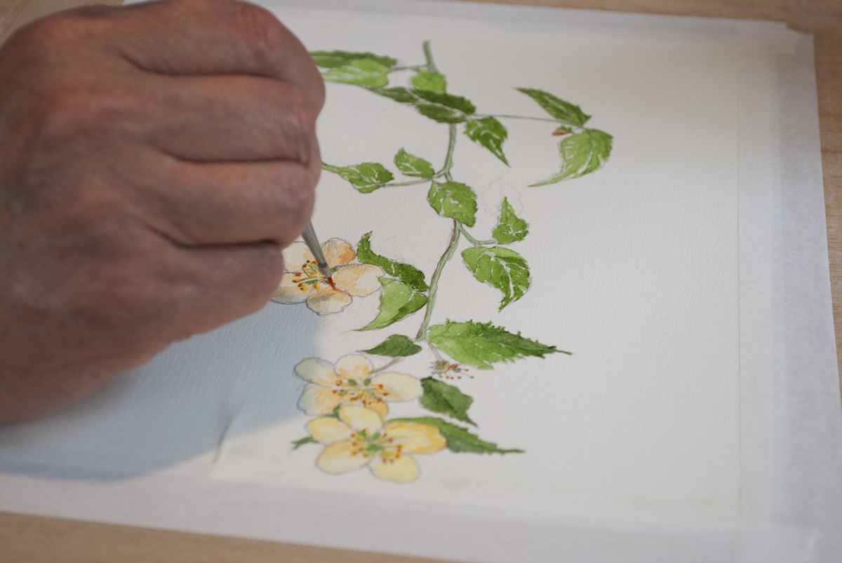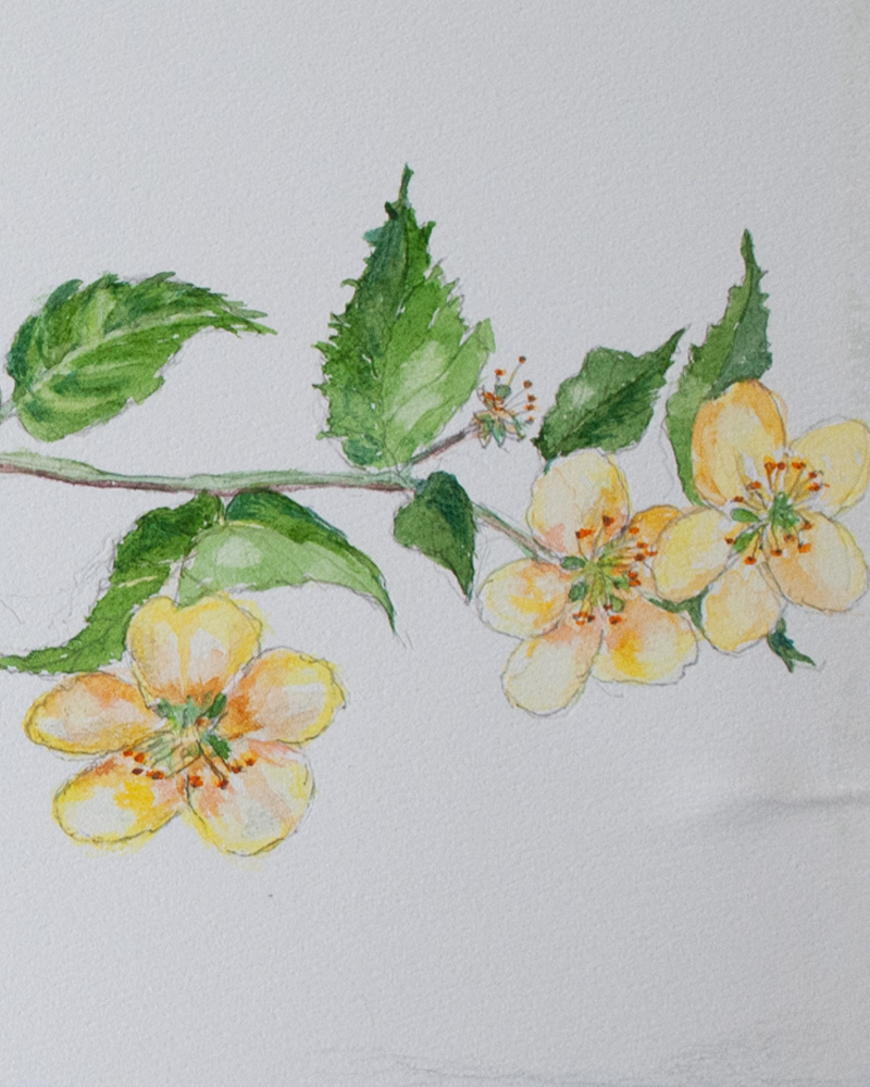 前回下絵を描いた「ヤマブキ」。本日は透明水彩で着彩にはいりました。