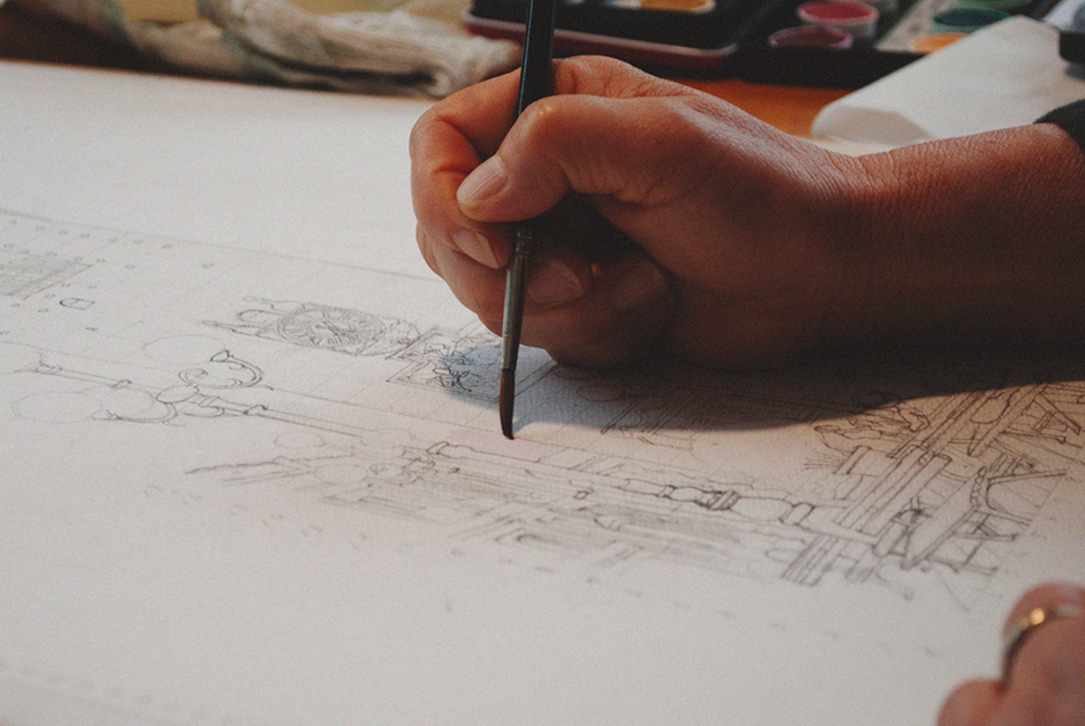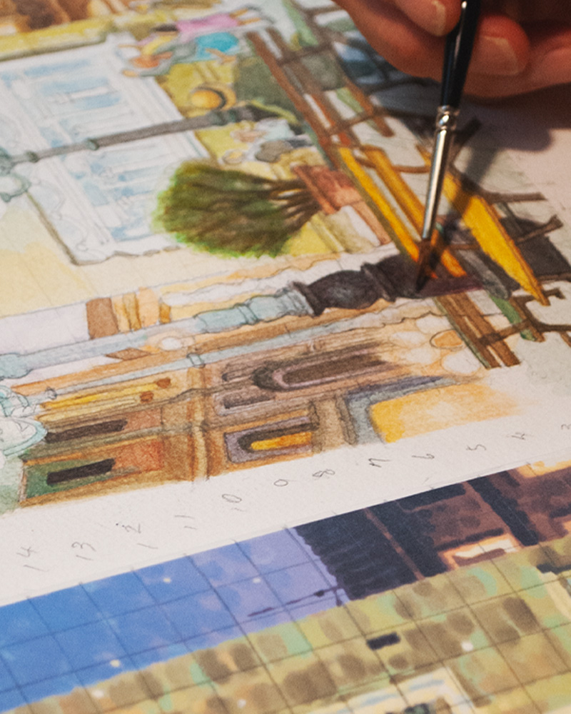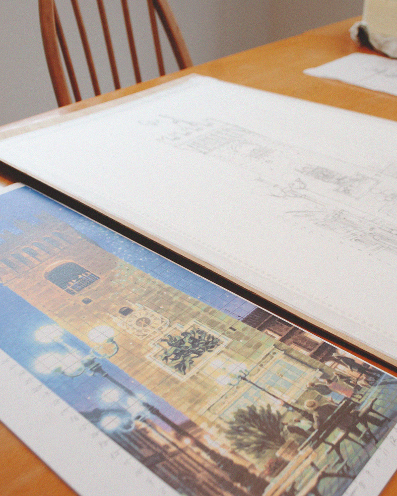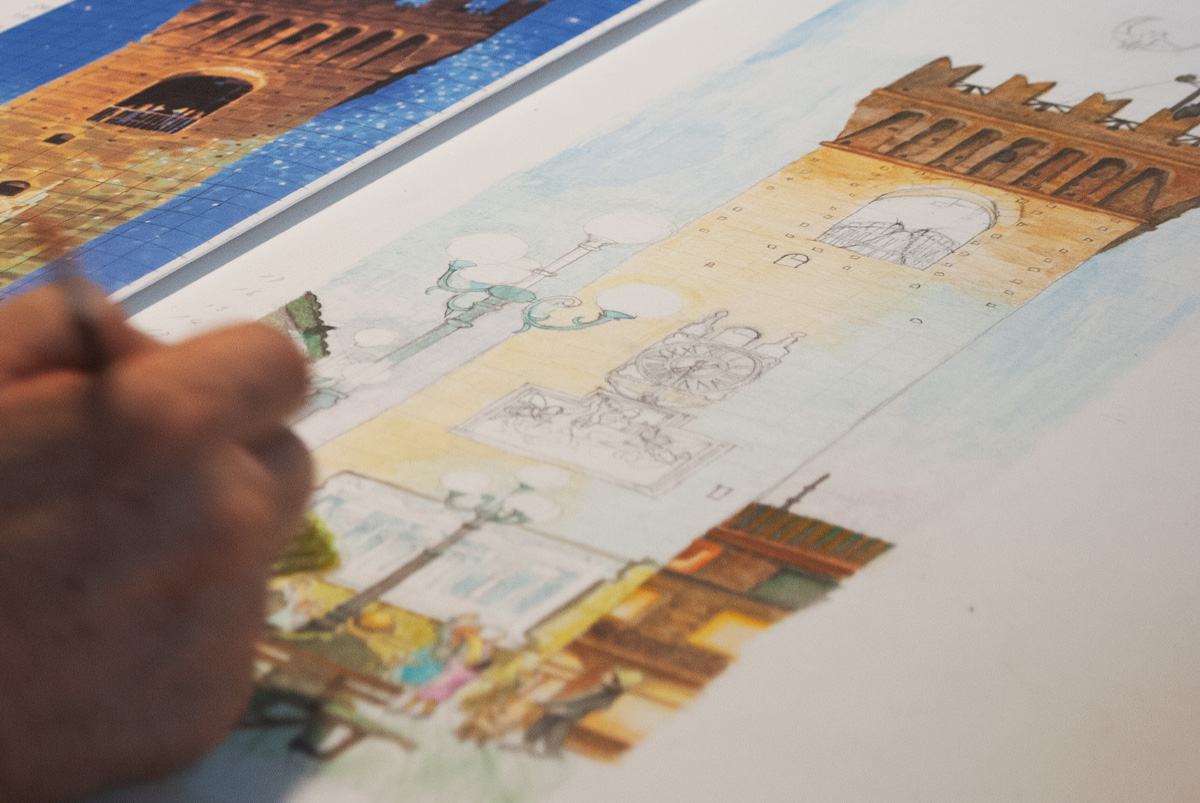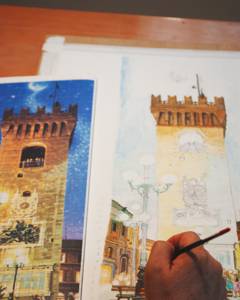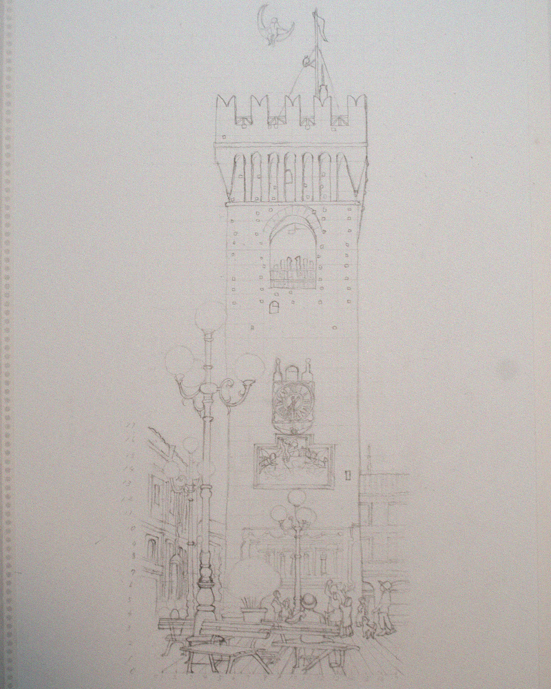 坂倉鉄平「ボルゴの塔」の模写。印刷した被写体と描画紙にグリッドをあてて、丁寧に模写をしています。本日は透明水彩で着彩に入りました。