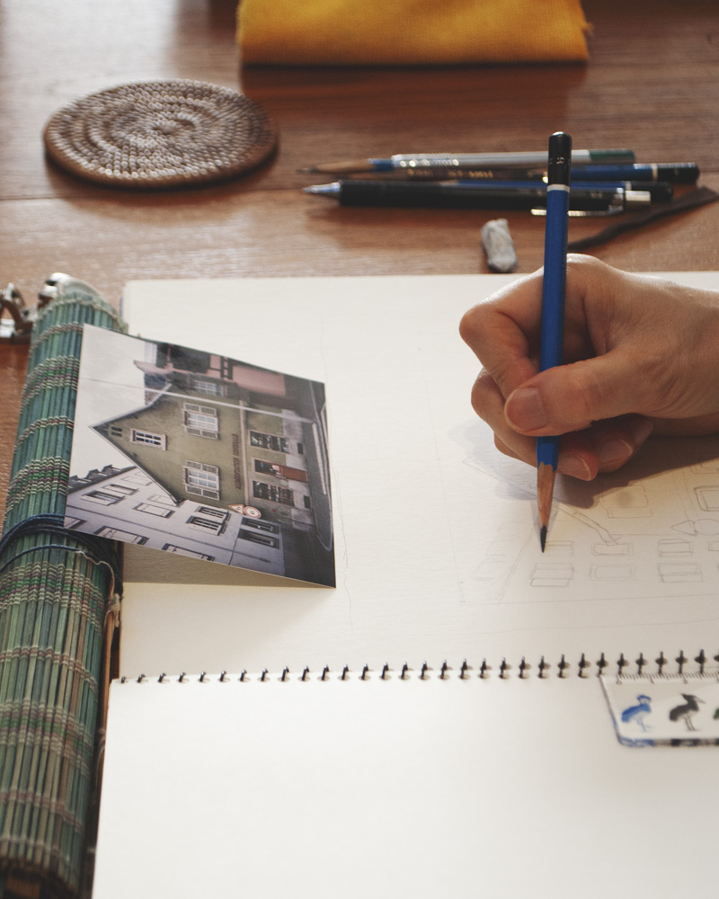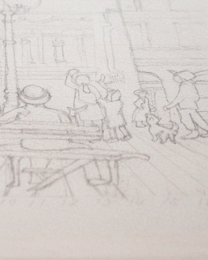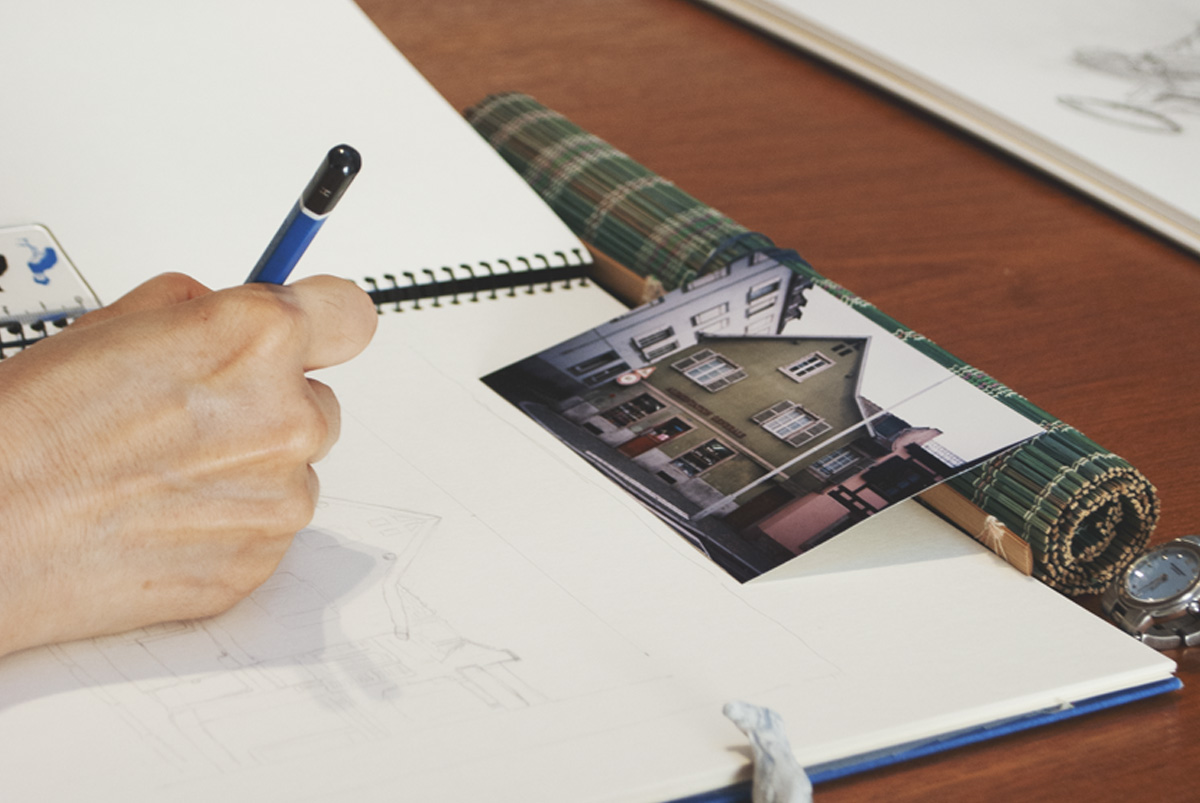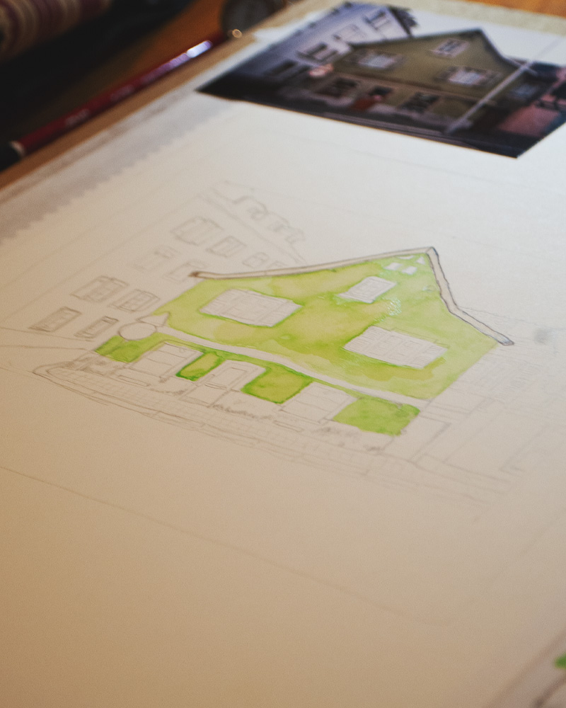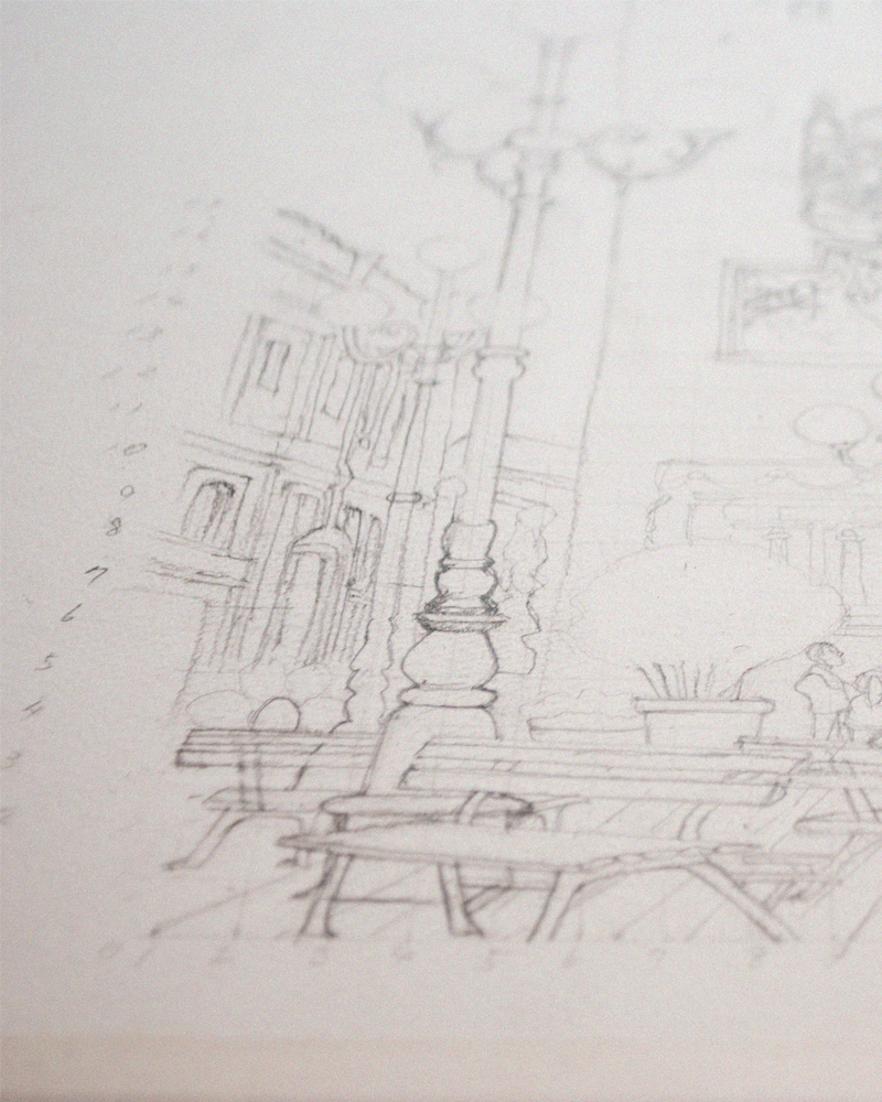 素敵なお家の絵を描き始めました。パースを取って下絵を書き進めています。