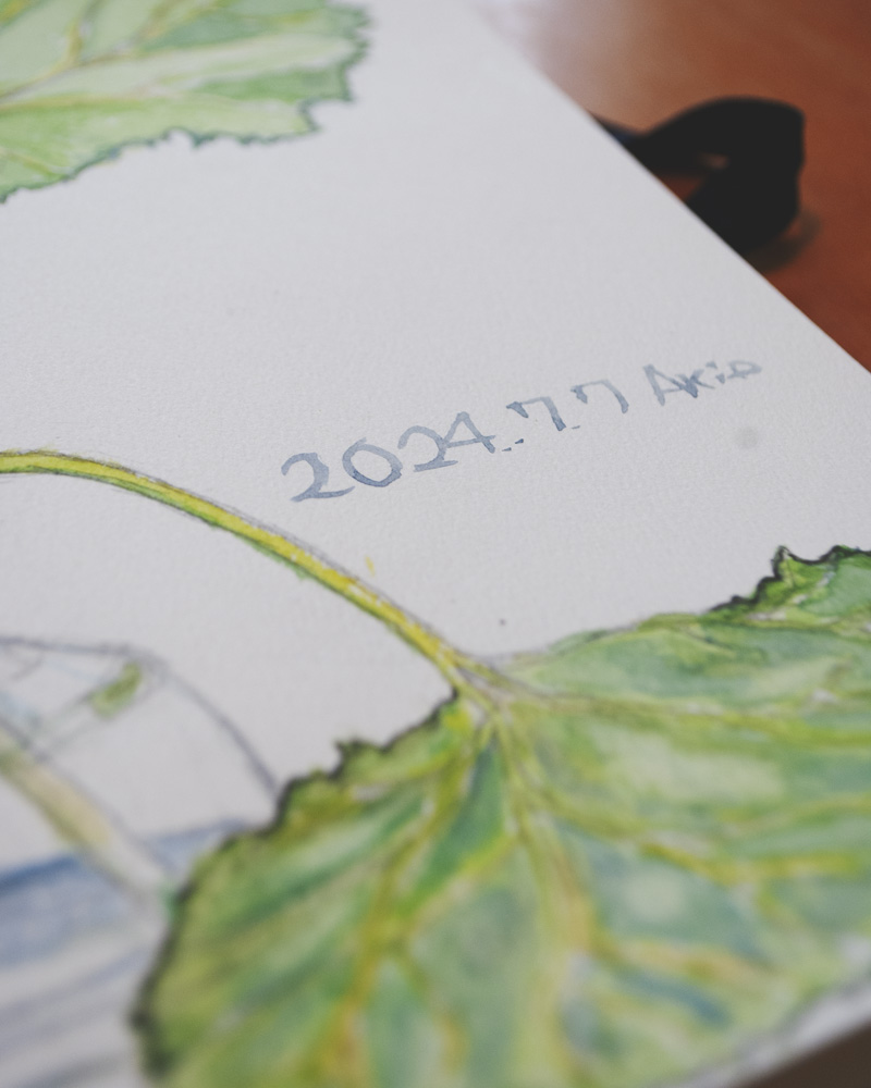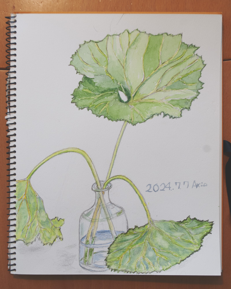水彩で蕗(フキ)を描きました。葉縁と、葉脈の表現が素敵です。