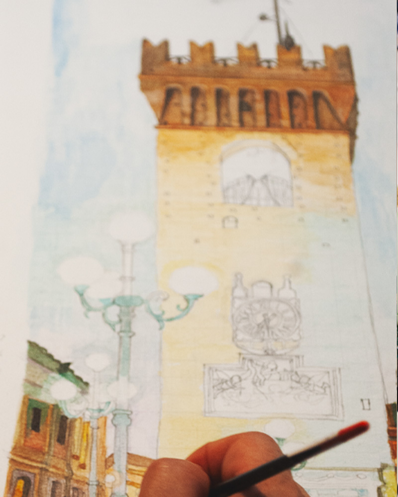 水彩画「ボルゴの塔」を描き進めています。精密な模写に素敵な色使い、完成が楽しみです。